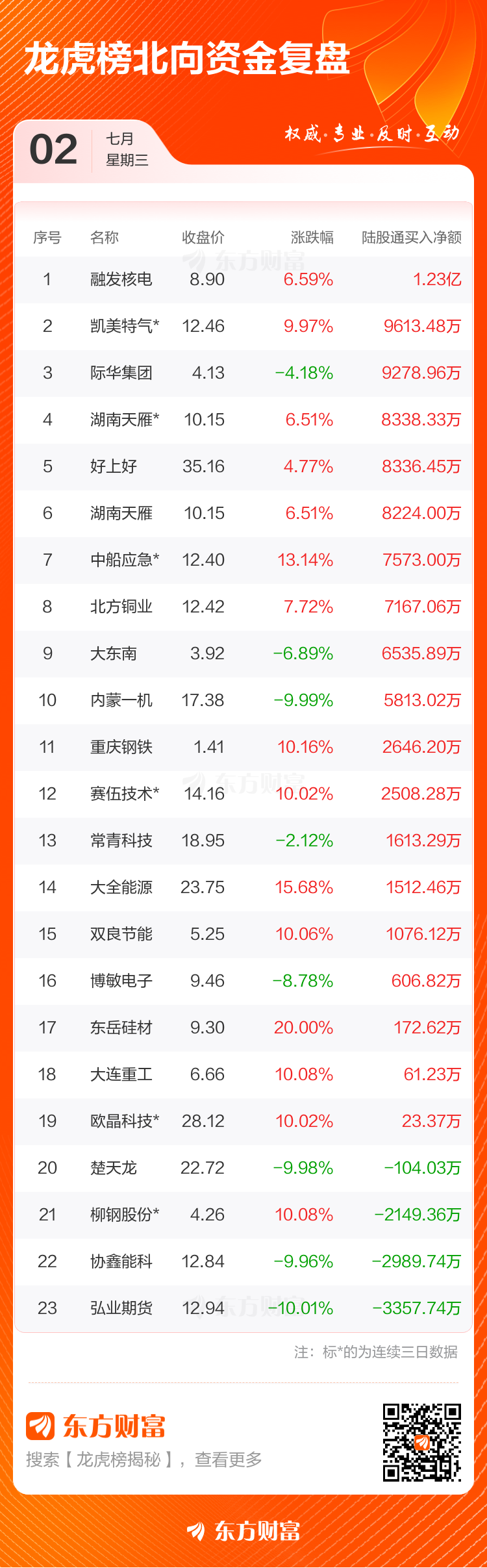 7月2日共有68只个股(含1只可转债)上榜龙虎榜,总上榜成交额139.18亿元。上榜个股中净买入额最高的是融发核电,金额为2.10亿元。