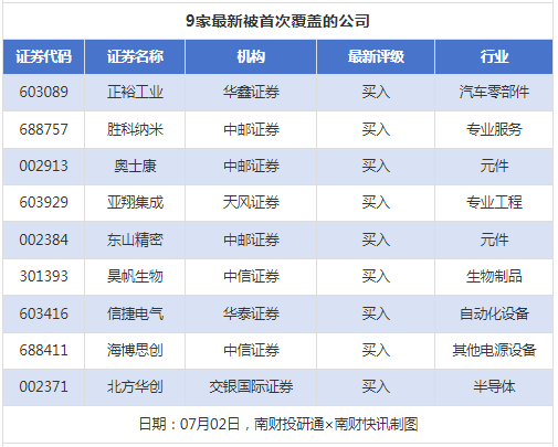 首次覆盖方面,7月2日券商共给出了9次首次覆盖,其中正裕工业获得华鑫证券给予“买入”评级,胜科纳米、奥士康、东山精密均获得中邮证券给予“买入”评级,亚翔集成获得天风证券给予“买入”评级。