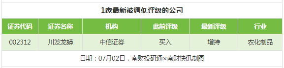 评级调低方面,7月2日,券商调低上市公司评级达到1家次,中信证券对川发龙蟒的评级从“买入”调低至“增持”。