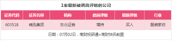 评级调高方面,7月2日,券商调高上市公司评级达到1家次,东北证券对锦泓集团的评级从“增持”调高至“买入”。