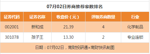 从券商推荐家数来看,7月2日有31家上市公司得到券商推荐,其中新和成获得4家推荐,孩子王获得2家推荐,领益智造获得1家推荐。