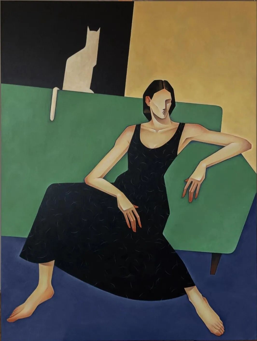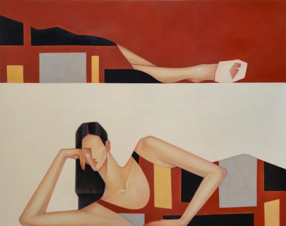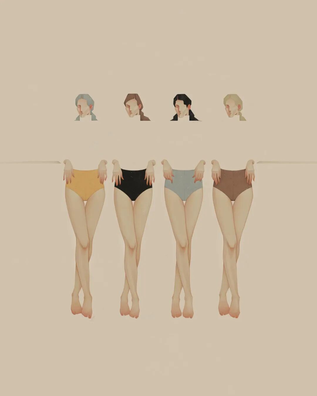 简单的圆形、方形、不规则图形等几何是构成她画作中极简主义的关键,然而,尽管这些构成的几何感明显,可与人物的造型感丝毫不冲突,反倒增添了其现代感与秩序感。