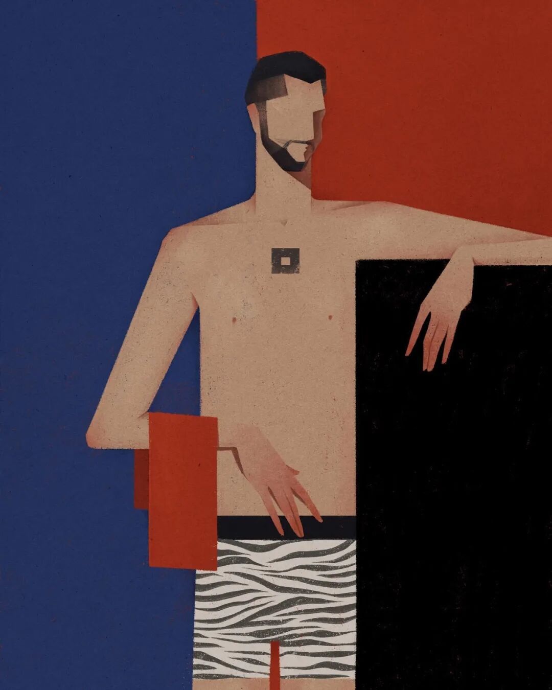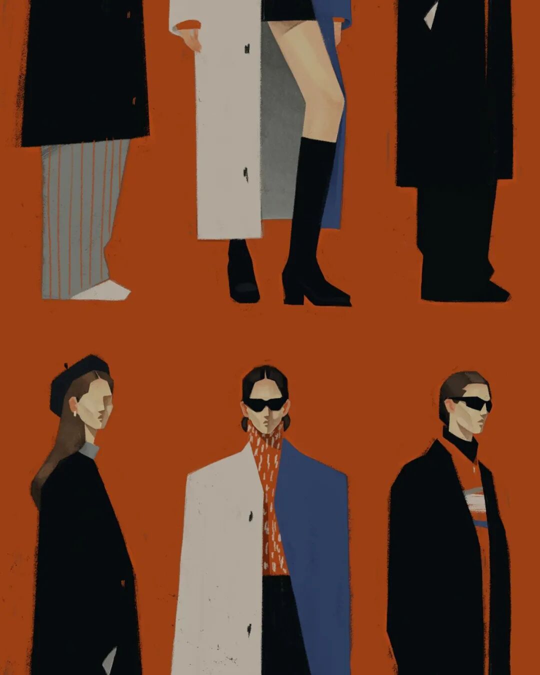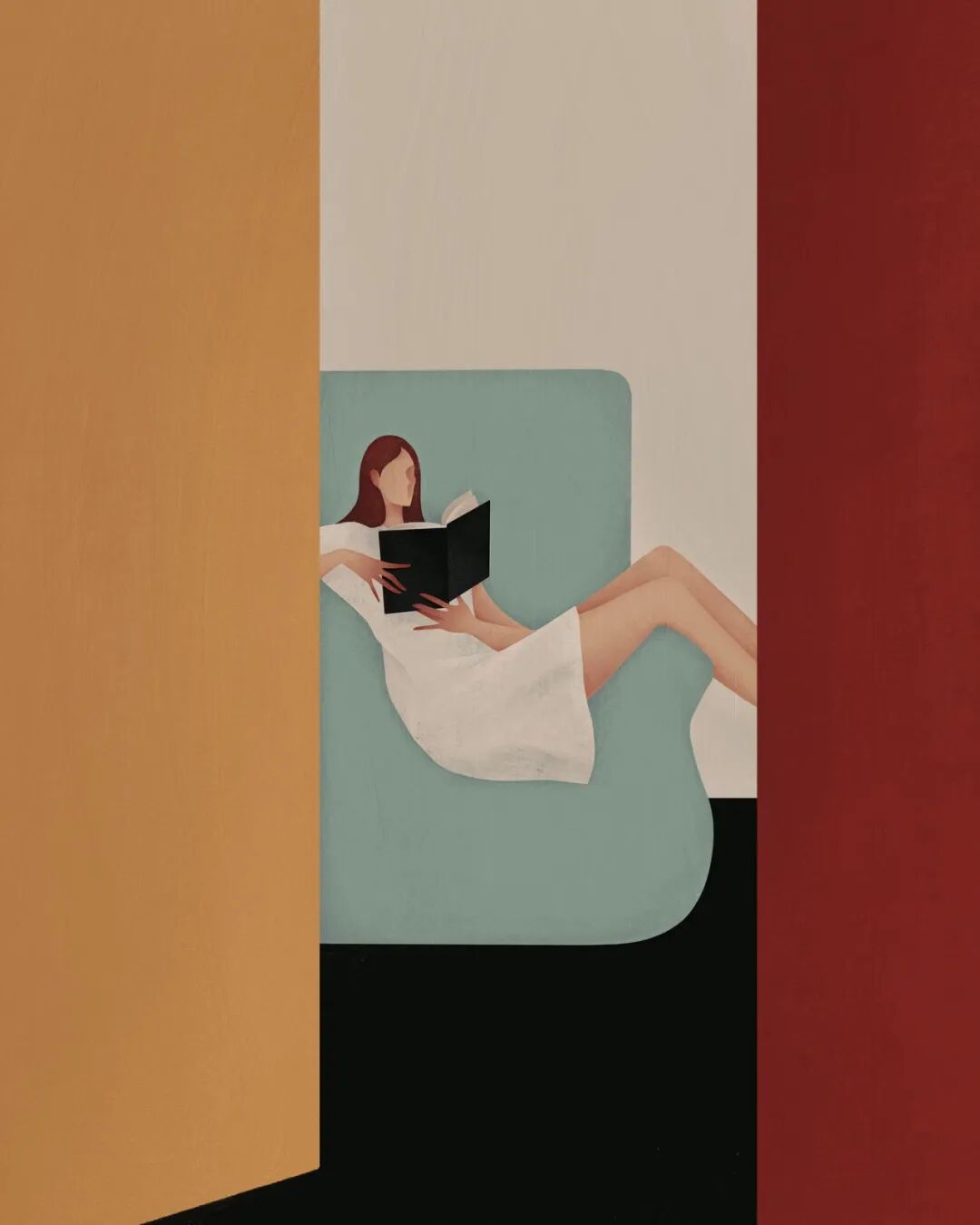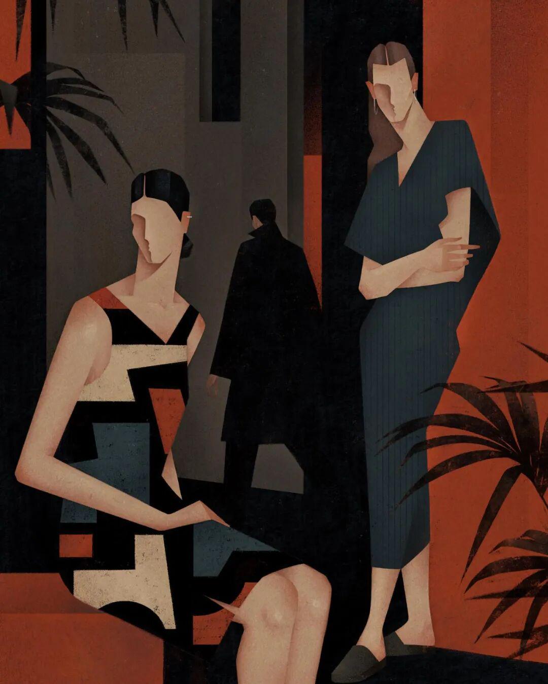 在Valeriya的插画里,过于简洁的线条往往被掩藏在色块与色块的关系里,存在感几乎降到了最低点。而她却利用最少的色彩元素,构建与表现出了完整的人物与场景。