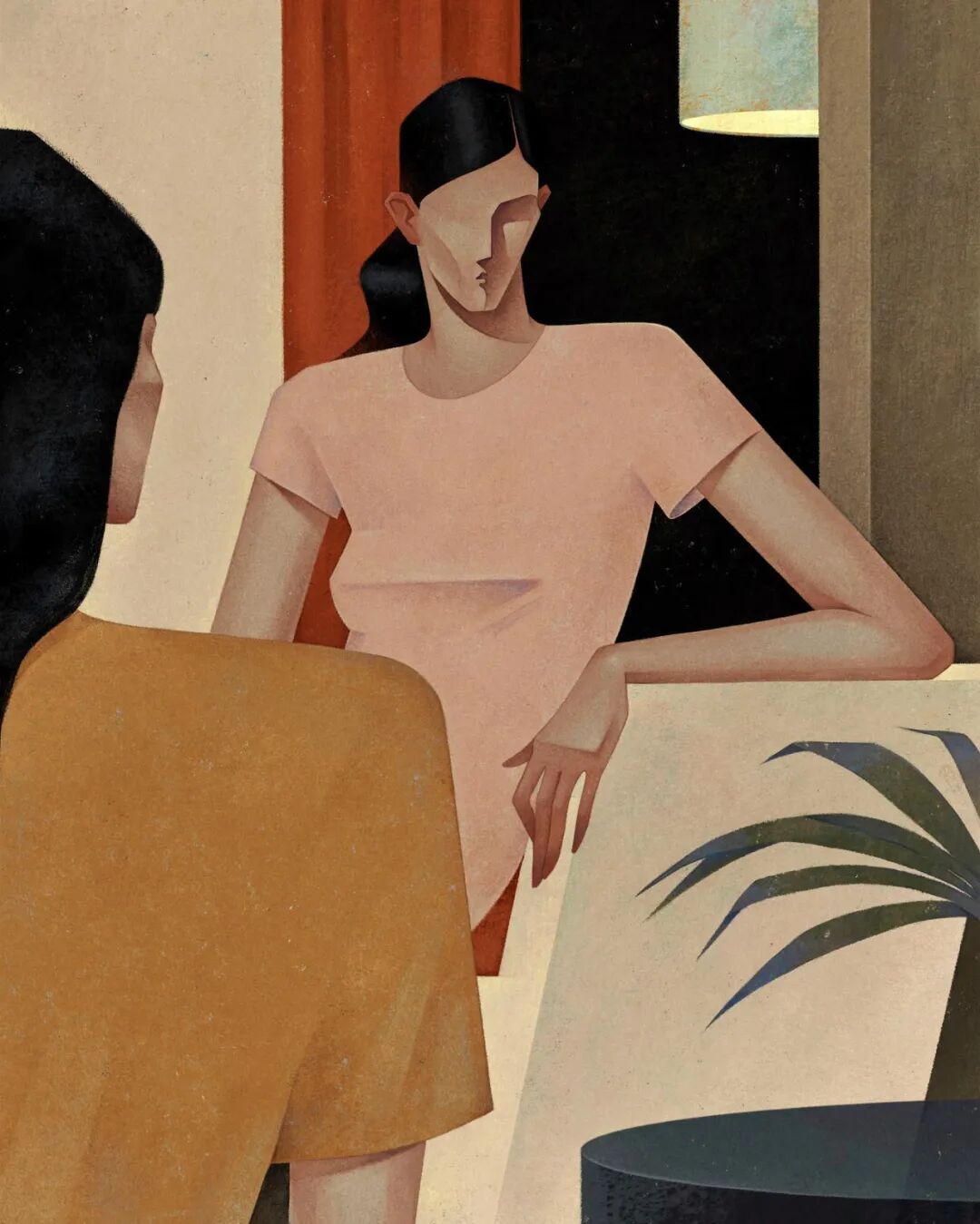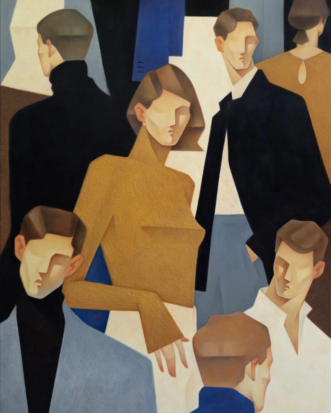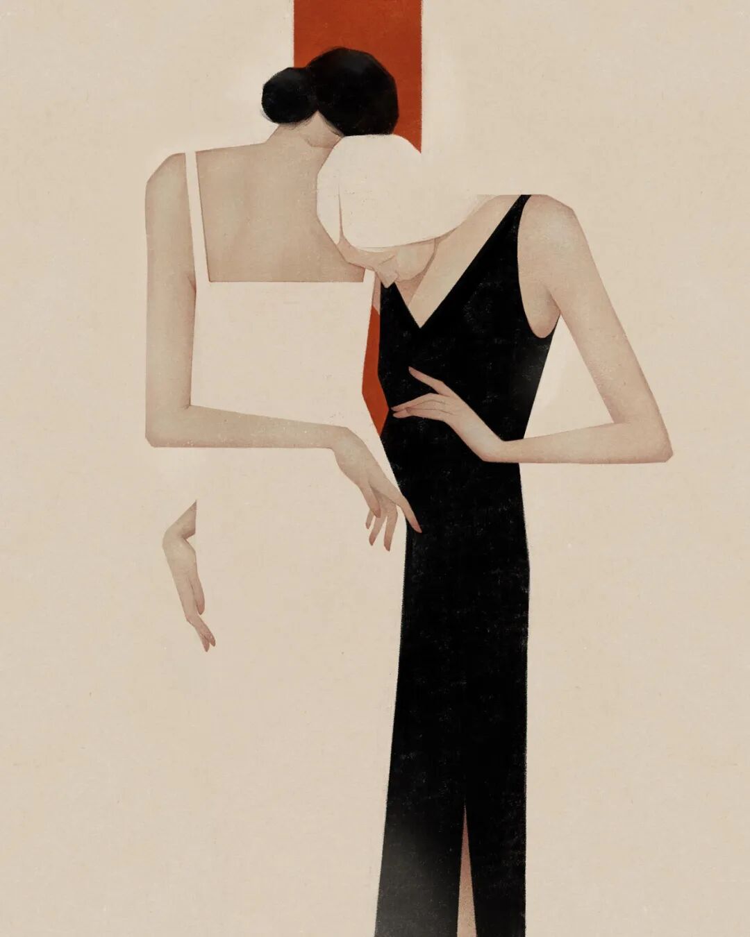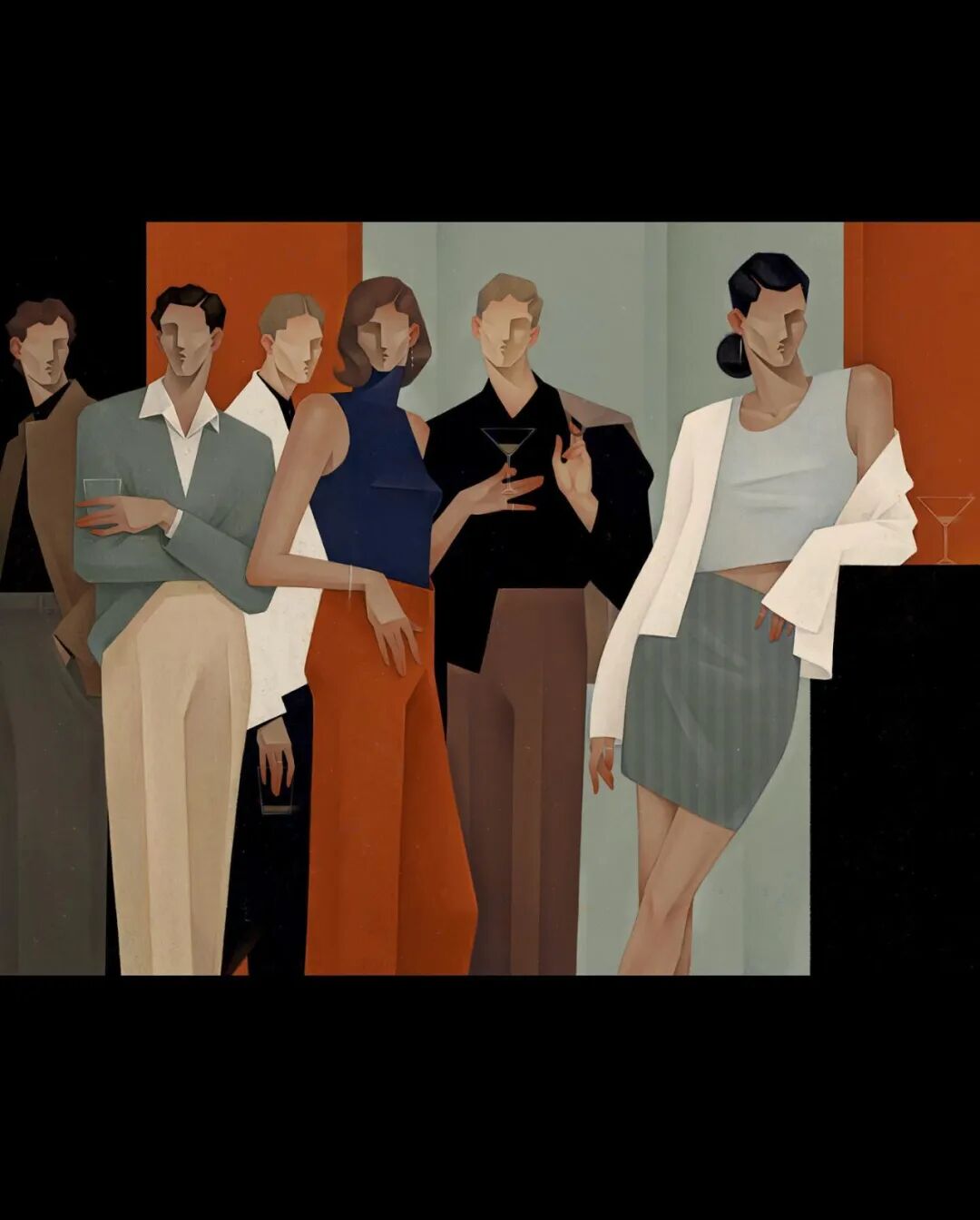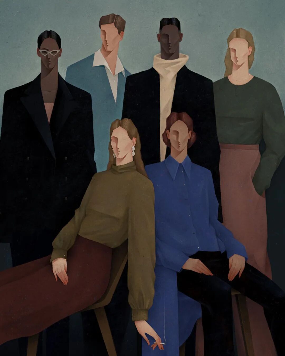 Valeriya画中的人物,没有精致细腻的五官描绘,更没有能透露出人物情绪的面部细节。但她却能精准传达出人物与人物之间的关系与氛围。