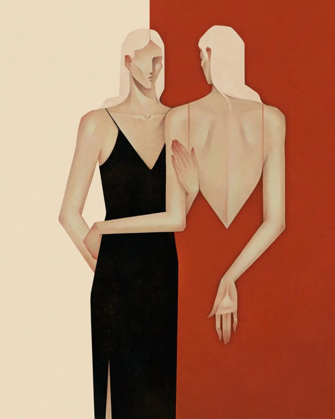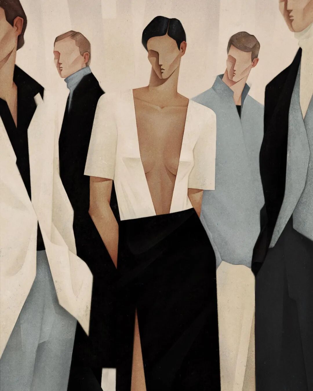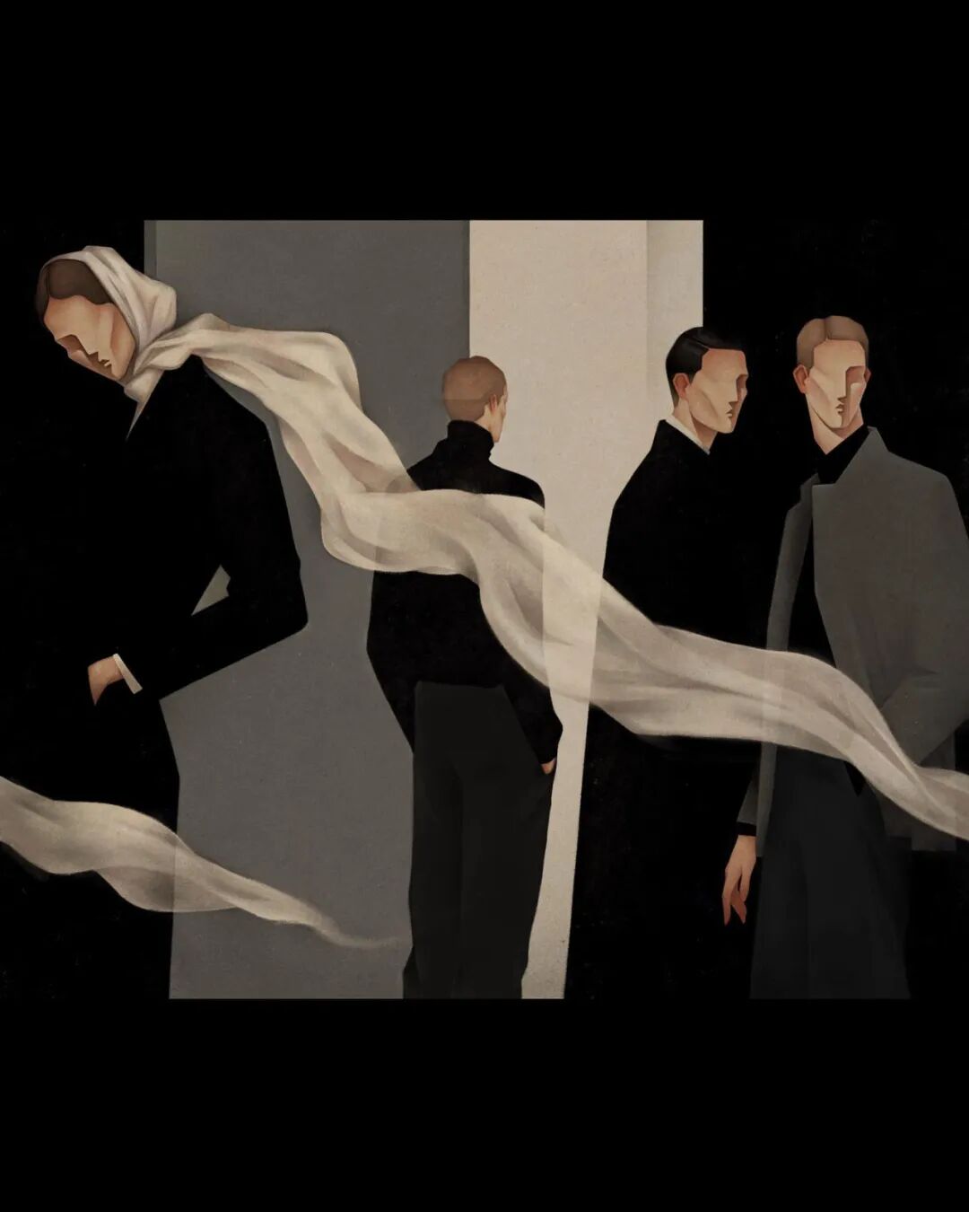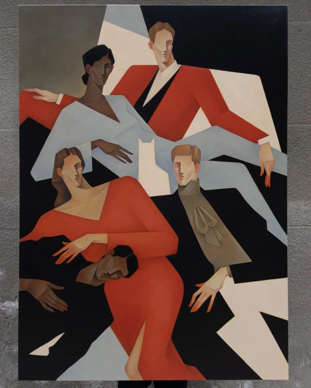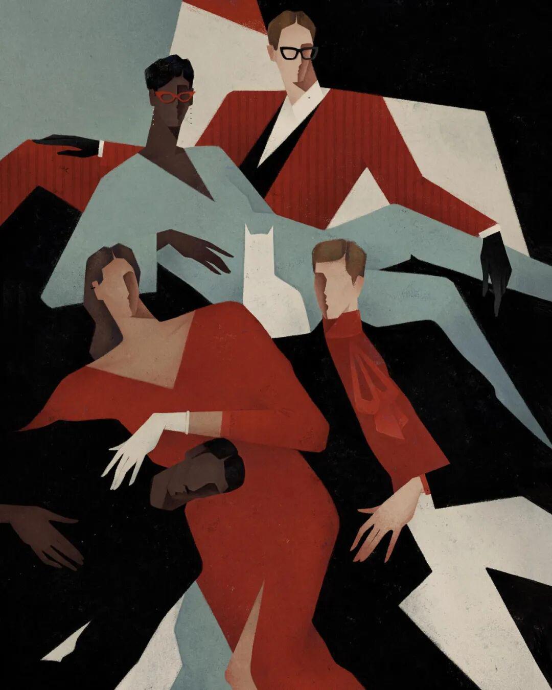Valeriya画中的人物,没有精致细腻的五官描绘,更没有能透露出人物情绪的面部细节。但她却能精准传达出人物与人物之间的关系与氛围。