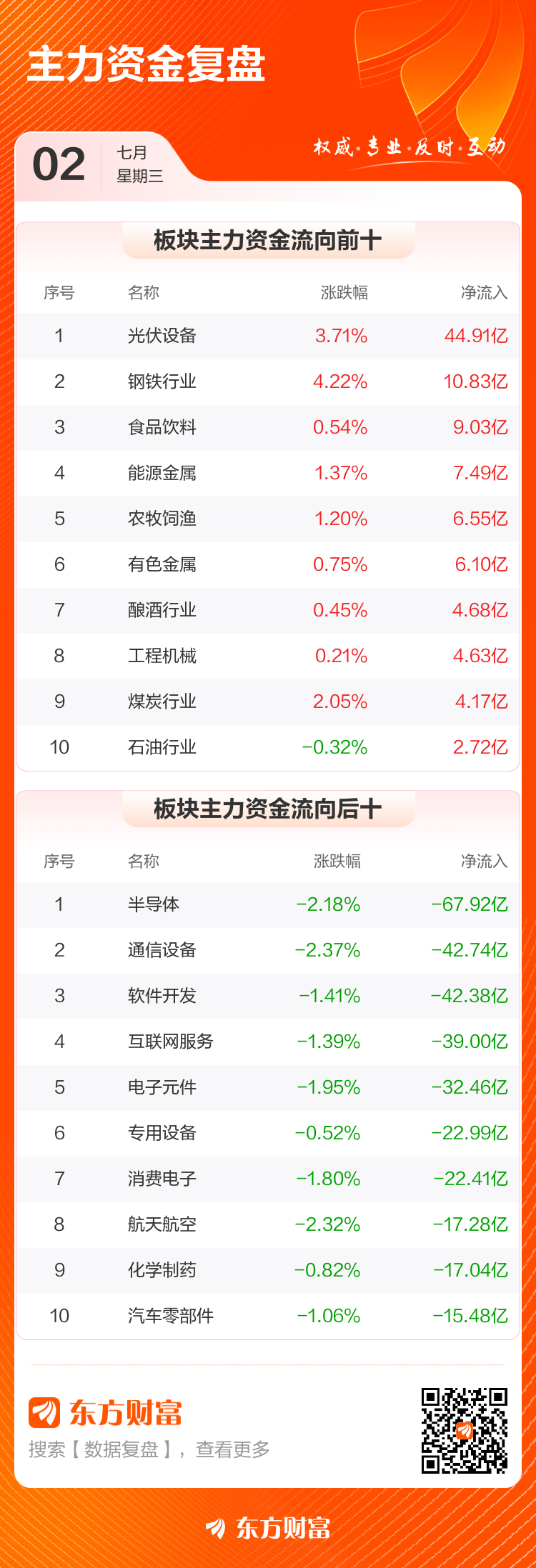 7月2日,沪指跌0.09%,深成指跌0.61%,创业板指跌1.13%。两市成交额1.38万亿,较上个交易日缩量891亿。数据显示,今日大盘主力资金净流出437.24亿。光伏设备、钢铁行业、食品饮料等板块主力资金流入排名居前,其中光伏设备净流入44.91亿元。